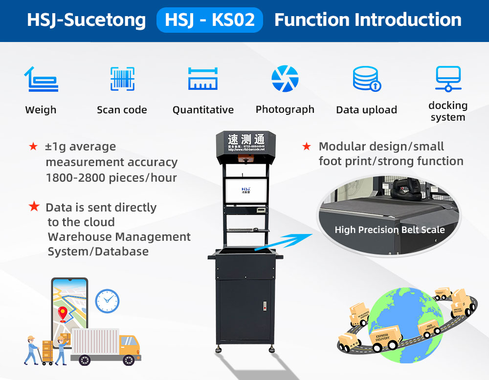 QuickTest KS series desktop automatic weighing and measuring volume system integrates barcode, weight and volume information automatic collection and input system, and prints face sheets in real time with printer.